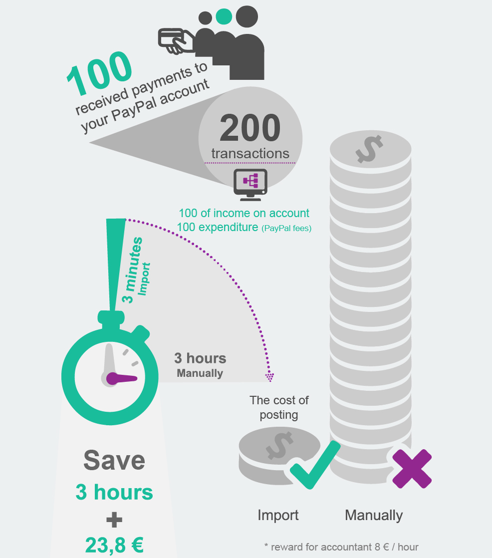 The difference in manual and automated recording of 200 transactions can make even more than 3 hours. At an hourly wage of 8 € for an accountant it makes 22.36 € saving for 100 received payments (issued invoices).